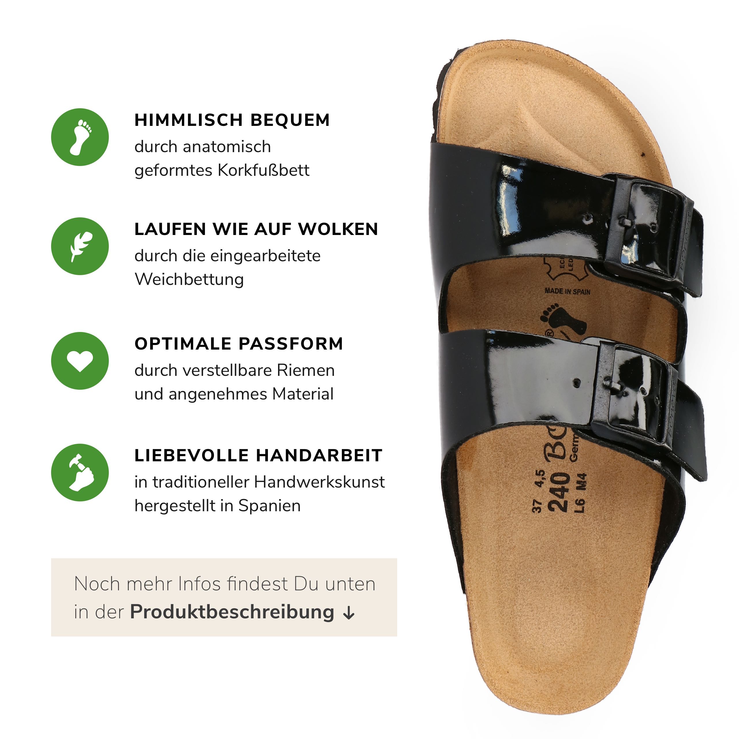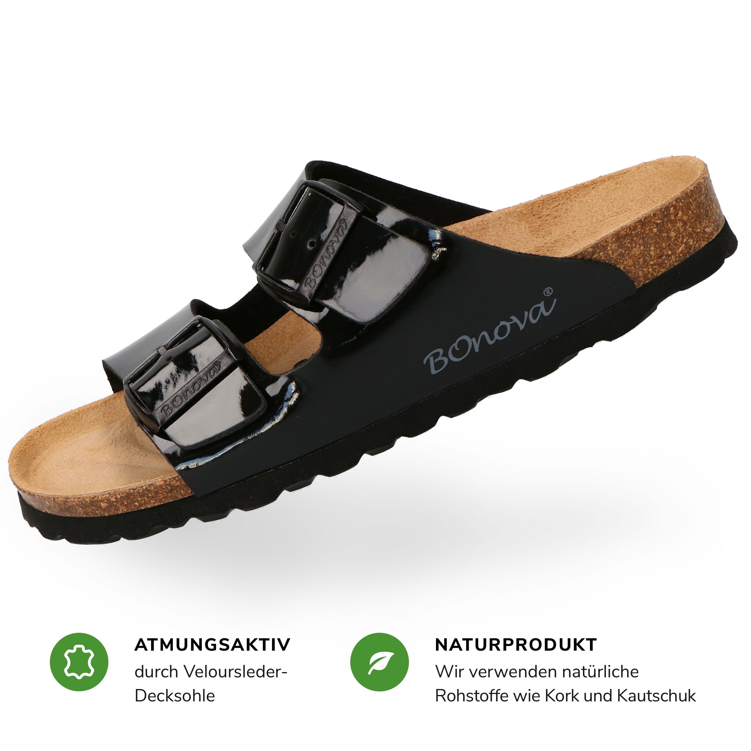 LEICHT UND ANGENEHM AM FUSS Unser eigens entwickeltes Obermaterial BOnoflor ist besonders hautfreundlich und vor allem pflegeleicht. Durch die glänzende Optik werden deine Füße zum Blickfang!